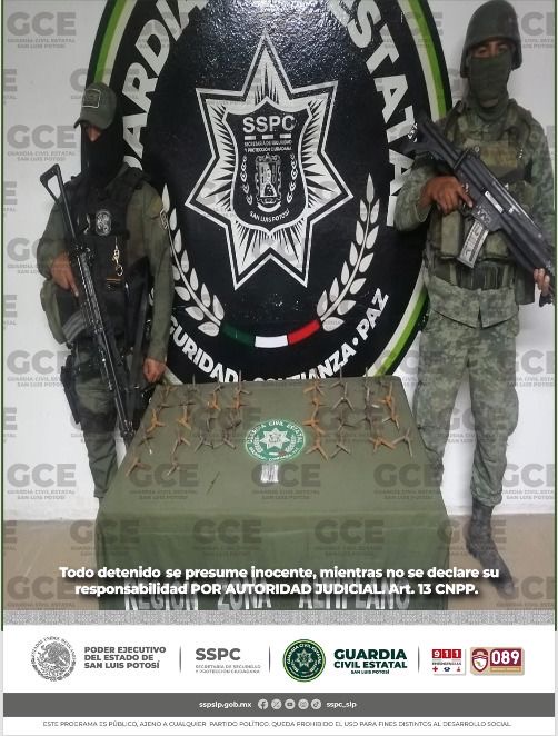 Tras las acciones de la Base de Operaciones Mixta Interinstitucional (BOMI), efectivos estatales y militares, aseguraron un vehículo en aparente estado de abandono, con las puertas abiertas, por ello se aproximaron a averiguar en la calle de Monte Michel, en la zona centro de Matehuala. Al interior de la unidad marca Ford, tipo Pick Up, color gris, se encontraron 11 cigarros de una hierba verde y seca, con las características físicas de la marihuana, así como 33 objetos “poncha llantas”.